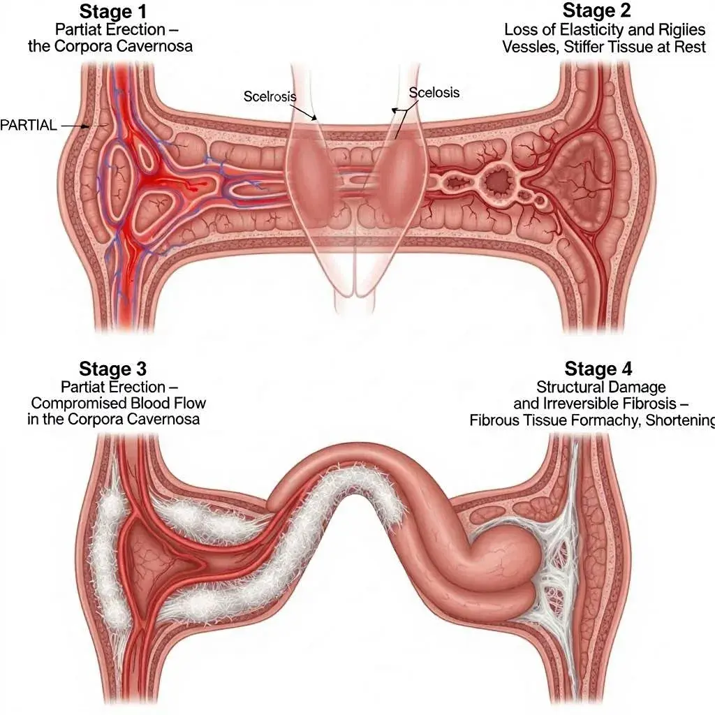 Yes, there’s a crucial difference that indicates different stages of progression. Weak or incomplete erections (Stages 1-2) indicate that blood flow is compromised, but tissue still maintains some functionality. Total absence of erection (Stages 3-4) signals that significant structural damage has already occurred with possible irreversible fibrosis. Many men make the mistake of ignoring weak erections, thinking it’s “normal for age.” This neglect is dangerous - weak erections are the last warning before total function loss. The longer you remain with weak erections without acting, the closer you are to the point of no return.